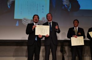 ▲主催者と記念撮影する小石副市長。県内の自治体では唯一の受賞です。